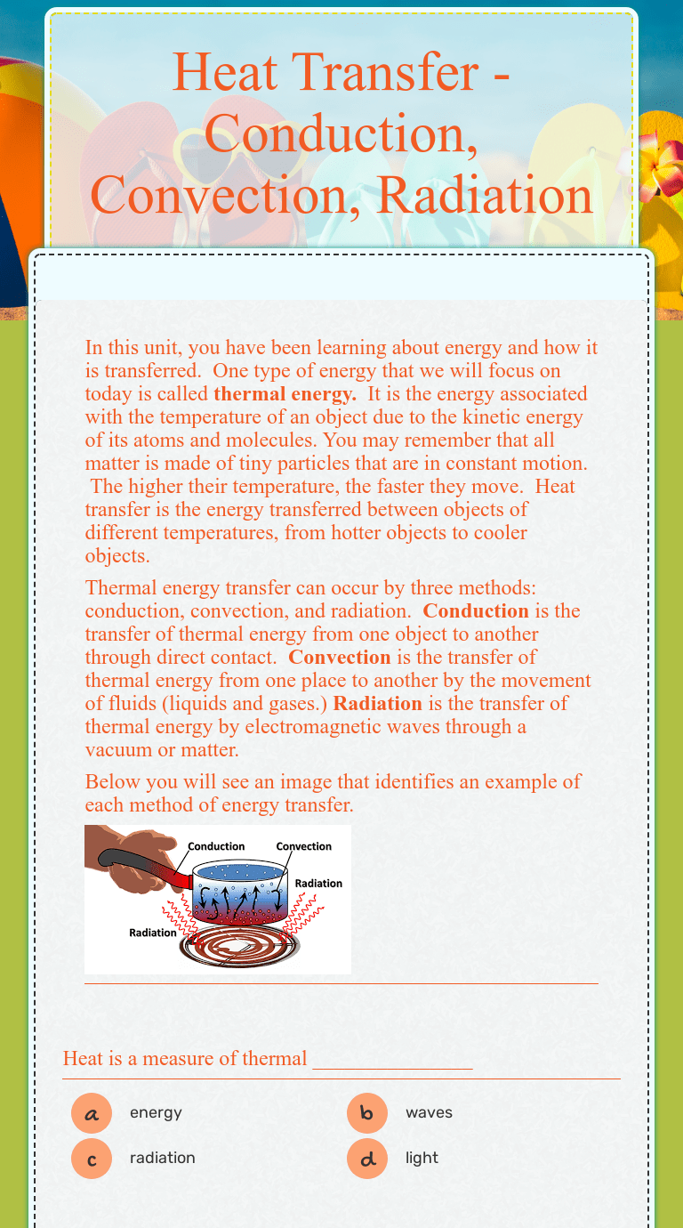 8Th Grade Science Heat Transfer Worksheet - Heat Transfer Team Review Quiz Worksheet For 8th 10th Grade Lesson Planet -. It is very important to know that, in science, heat and temperature are not the . There is more space between them making it expand. It can occur by conduction, convection, or radiation. Ways to transfer thermal energy. These atoms, in turn, transfer some of their increased energy to neighbors even farther from the original source of heat.